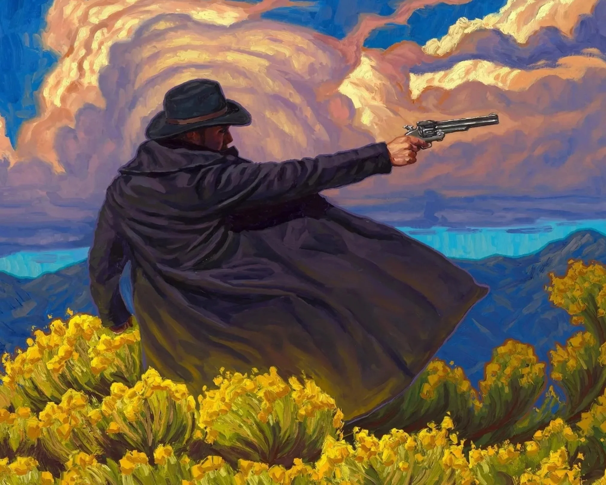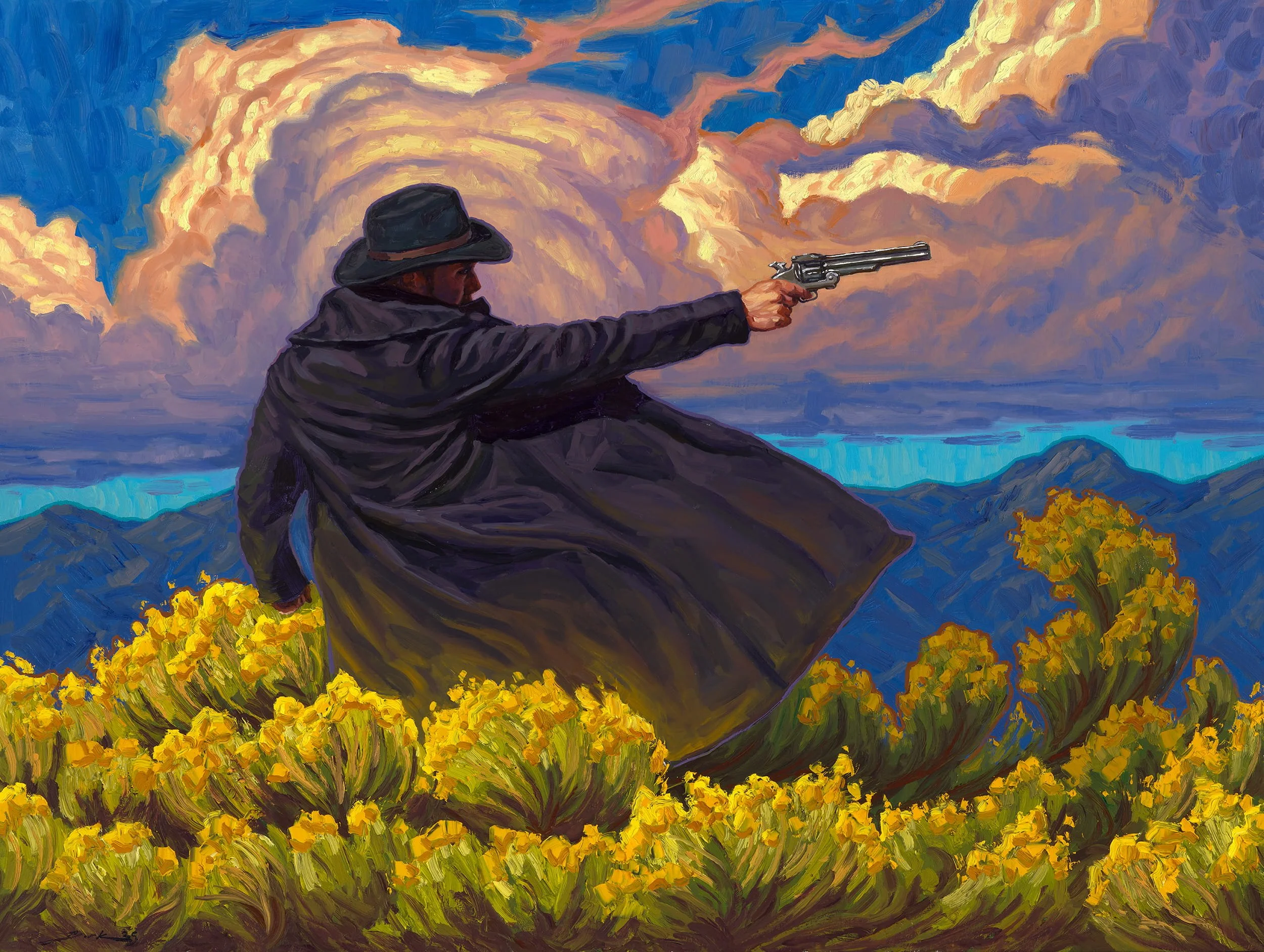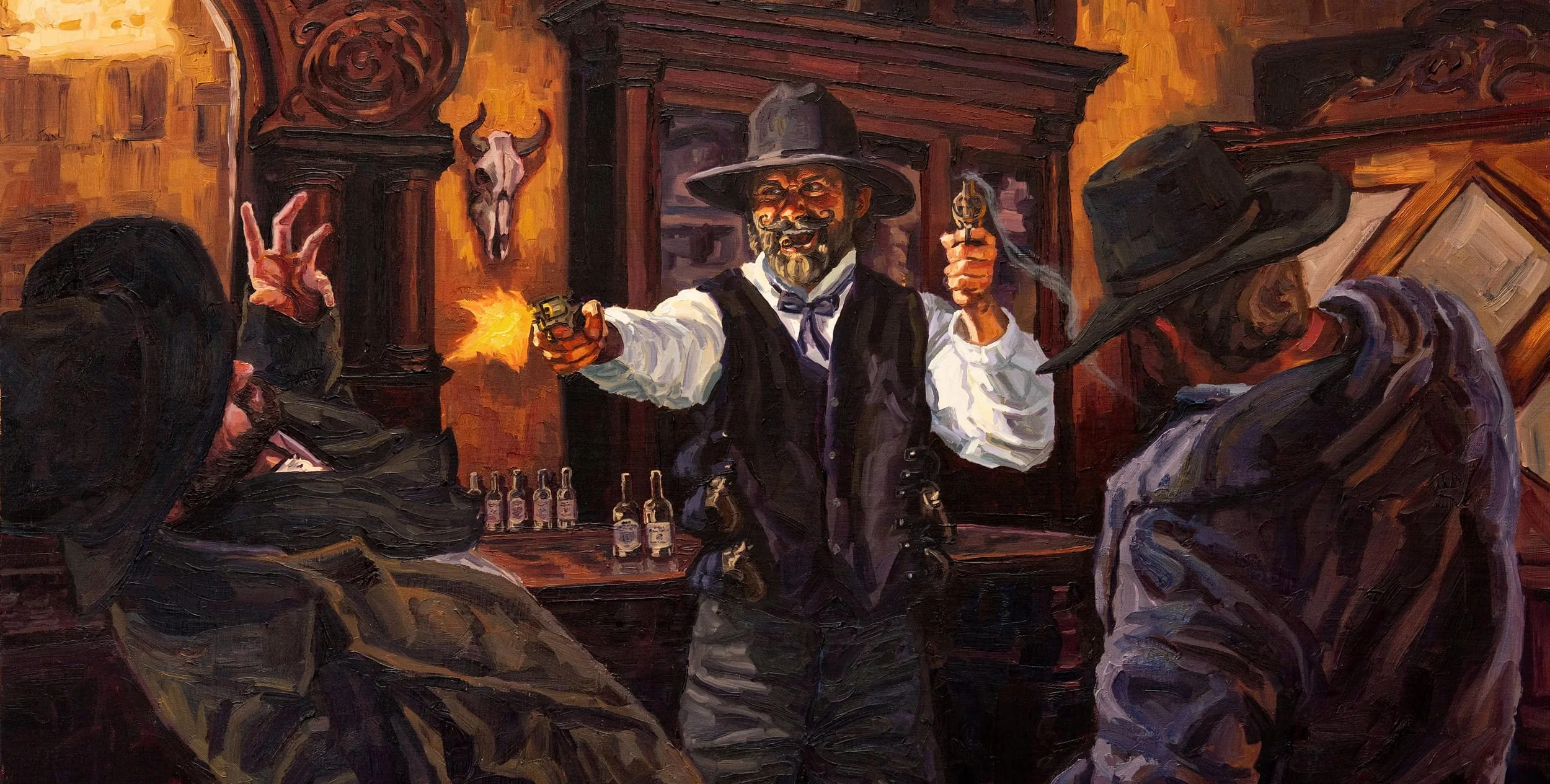 The Gunpowder Trail began as a simple idea. Carl Bork wanted to paint gunslingers flying across the canvas, locked in dramatic shootouts. As he learned more about Salida’s history, Carl began to wonder: “What if I added a story to these paintings and set it here in Salida?” Around 2021, time passed, and Carl reconnected with his childhood friend Matt.