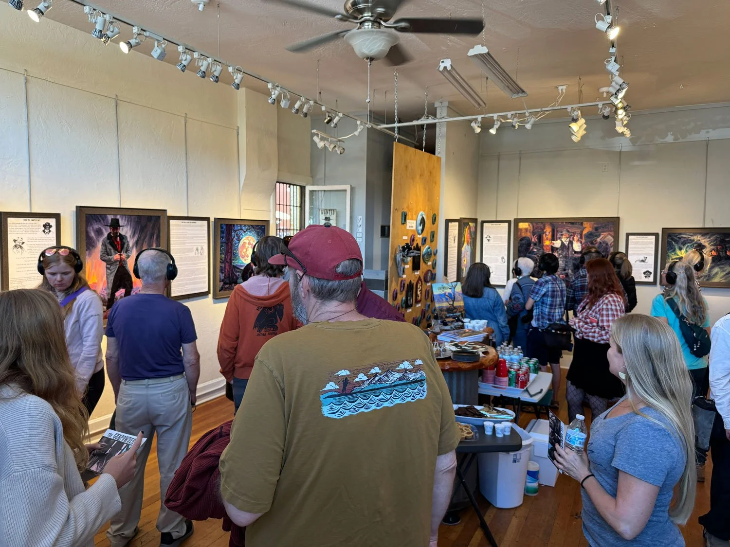 Through a series of phone calls, Carl and Vic mapped out the project as a three-act story, each act divided into four parts. They exchanged drafts, traded ideas, and refined the vision together. Before long, they realized they were creating something they themselves would have loved to see on the big screen. The project became not only a celebration of Salida’s rich western heritage, but also a sweeping adventure that embraced the broader history of the American West.  As they fleshed out the story, Carl thought it would heighten the immersive experience if the show had an audio narration that people can listen to while they looked at the paintings. That’s when Carl remembered his good friend from college Justin Greathouse did voice over work! Justin quickly jumped on board and, thus, the band was formed.